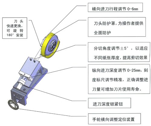 可进行分切系统改造,用于平切机,复卷机等分切机构。配置自动控制程序,定位精确,可与底刀联动,切边整齐,结构强度高。适用于柔性材料分切,例如纸张,塑料薄膜,玻璃纤维等。